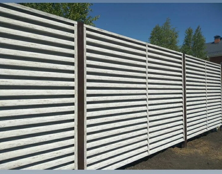 Забор-жалюзи с ламелями Еврожалюзи от ТПК Центр Металлокровли цвет Белёный Дуб ⠀ ✅ Забор установлен в городе: Тюмень ✅ Вид секции: забор-жалюзи ✅ Столбы: металлическая профильная труба ✅ Профиль металлических ламелей: Еврожалюзи ✅ Цвет и покрытие ламелей: цвет Белёный Дуб