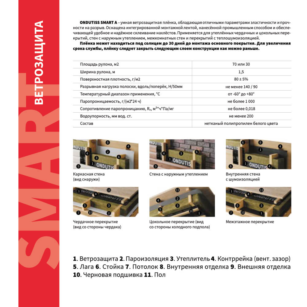 ONDUTISS SMART A – умная ветрозащитная плёнка, обладающая отличными параметрами эластичности и прочности на разрыв. Оснащена интегрированной монтажной лентой, нанесённой промышленным способом и обеспечивающей удобное и надёжное склеивание нахлёстов. Применяется для утеплённых чердачных и цокольных перекрытий, стен с наружным утеплением, межкомнатных стен и перекрытий с теплошумоизоляцией.